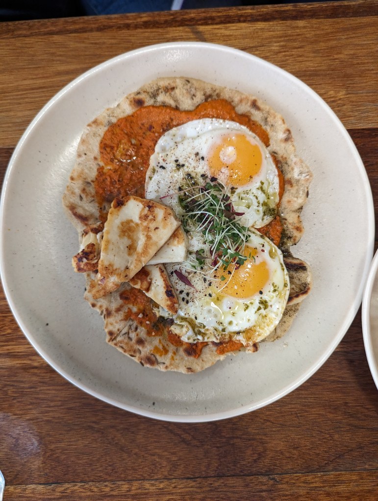 The day started at Wayland’s Yard, a notorious breakfast spot in Worcester offering an array of cuisine mostly involving eggs. Dog friendly, as we had Knuckles with us, we were warmly greeted by a member of the team and seated at one of their rustic wooden tables. Placing our order via QR code at the table after selecting what we wanted to eat. HT had Turkish Eggs and theHouse Sparkling raspberry lemonade whilst LC decided on Avo Pico Toast and a Classic filter coffee and RS chose Lebanese eggs with extra halloumi and an orange juice.