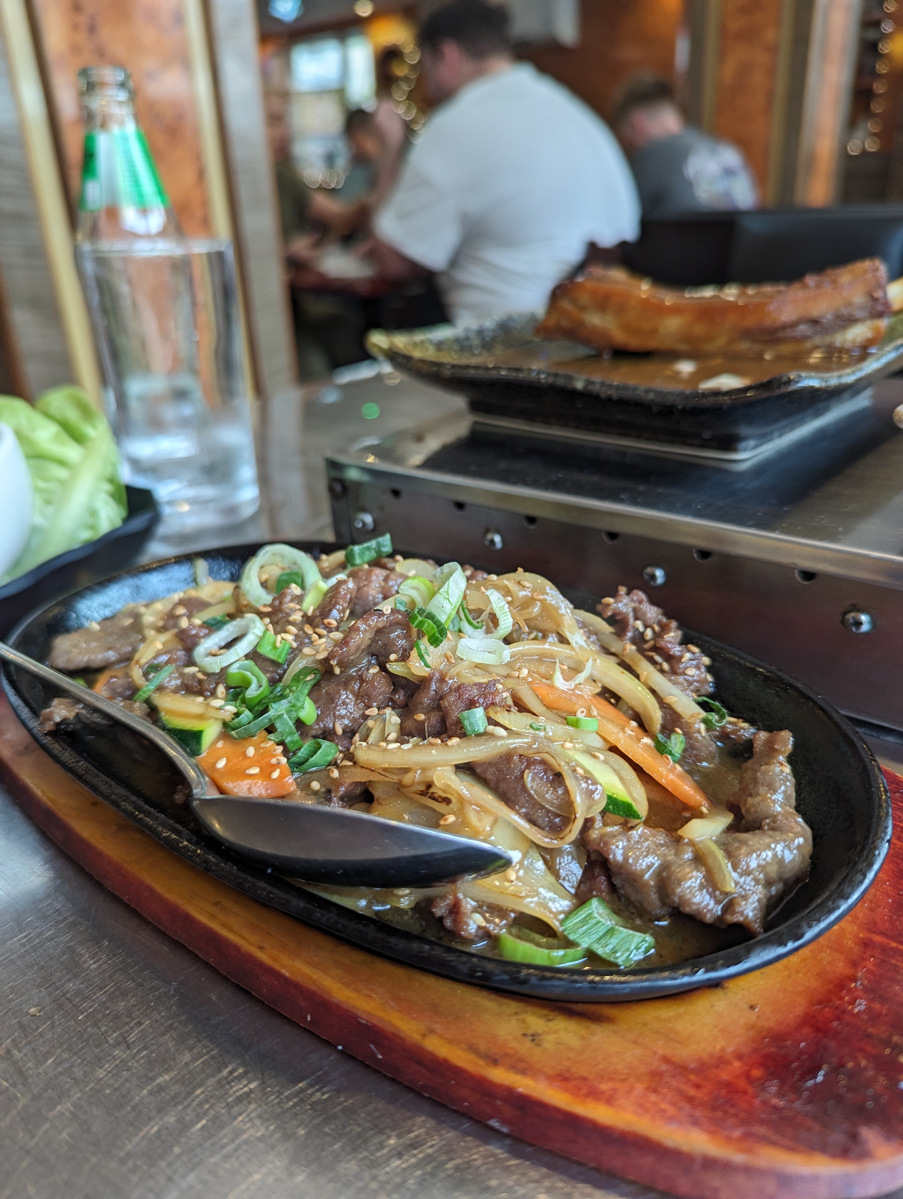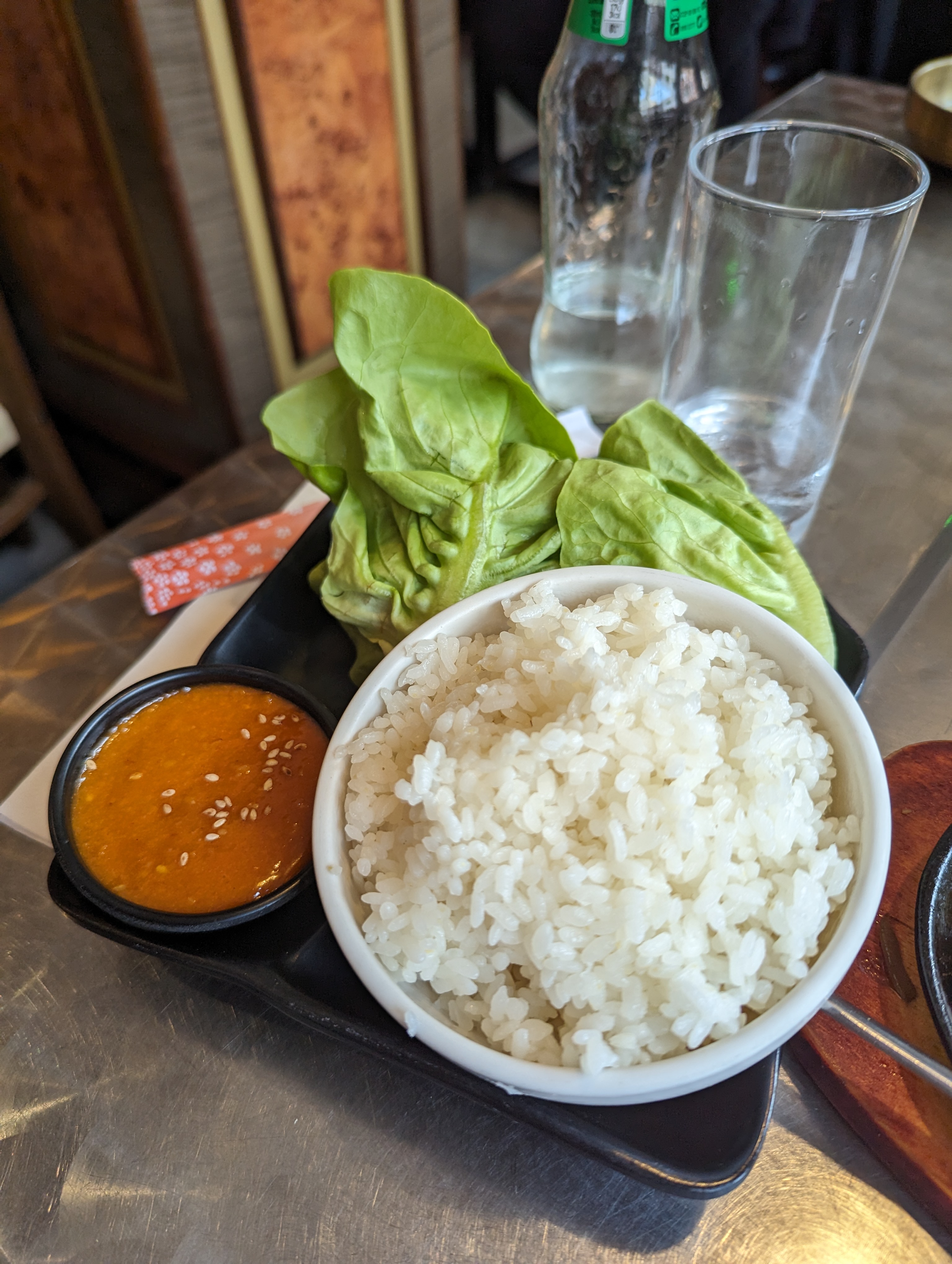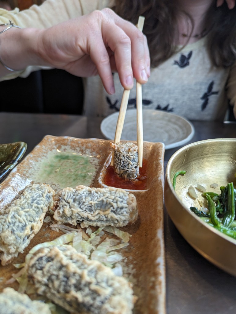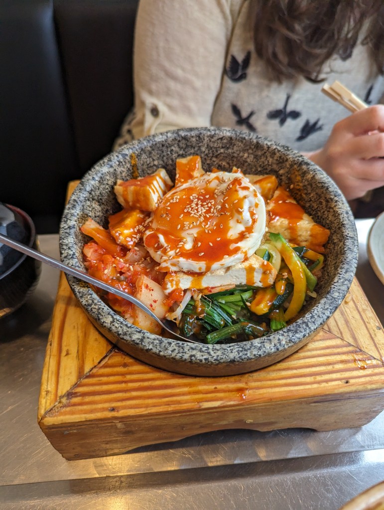 It’s always so hard to pick when the menu is so vast but determination ensured as many different options were tried as possible. Although starters were ordered, it was good to see food being brought to the table as soon as it was ready so it was hot. The exception to this was the side order of spinach which was unexpectedly cold. No real comment to be made about this part of the meal. Spinach is spinach, sometimes need to see a green thing on your plate. The two favourites among the starters for different reasons were the Kimchi pancakes and ribs. HT wasn’t expecting to like the pancakes but agreed with LC and RS that they were a good choice. The ribs arrived and were huge, so much meat that melted off the bone but had some crispy bits to add texture and dripping in sauce. Deep fried seaweed stuffed with glass noodles were more fiery than anticipated and would probably not be ordered next time. The silence that had descended as the meal was consumed was remarked upon by LC who stated ‘don’t think we’ve been this quiet at dinner ever’. Not sure if it was the hunger or the amount of food or the absorption into the task at hand but some really delicious food was presented and were feasted upon.